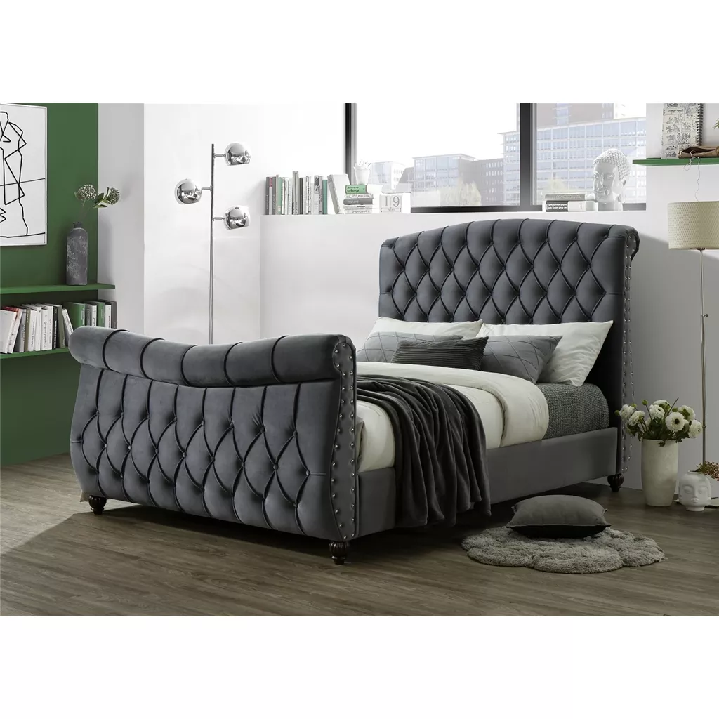 Exquisitely upholstered in plush dark grey velvet fabric, this stunning bed frame features a traditional sleigh bed design. Deep buttoning enhances comfort, while the frame showcases scrolled bed ends, an arched headboard, and a gently dipped footboard.