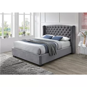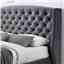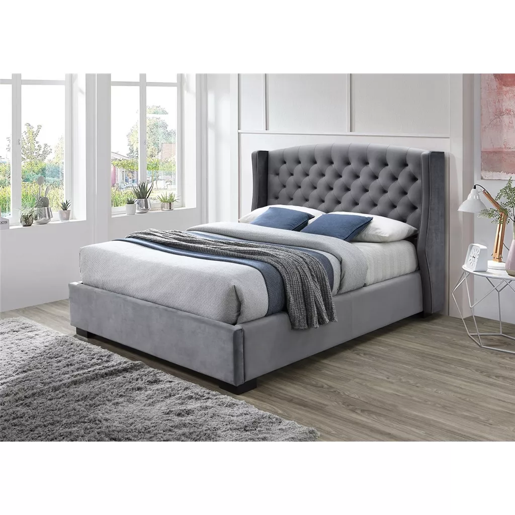 Upholstered in a plush dark grey velvet fabric, features deep buttoning and hotel style wings on the headboard.