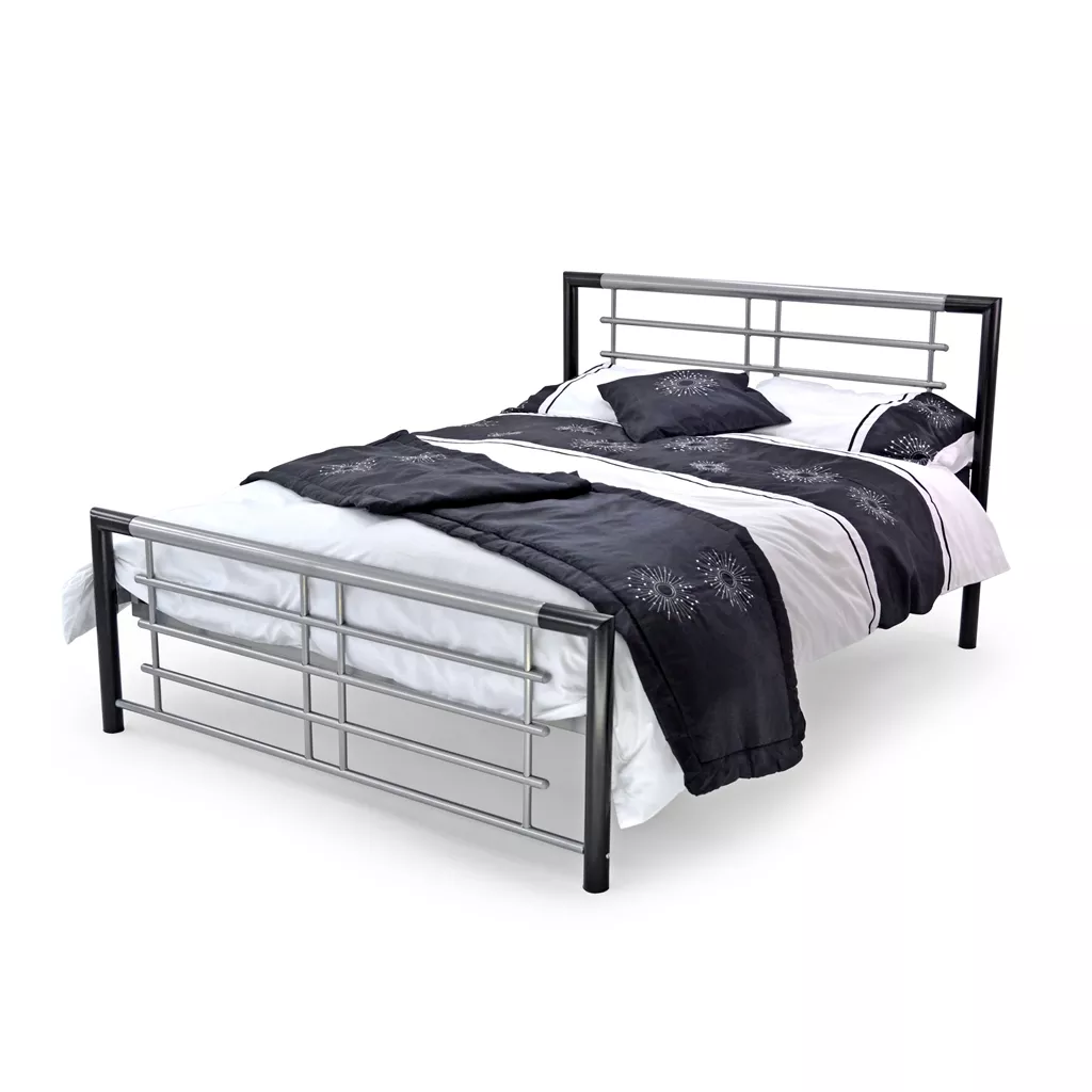 This modern frame has a simple but stylish contemporary design. It has a black and silver finished frame making it a perfect fit for modern styled bedrooms. It has contract specification strength so requires no centre support legs and has sprung wooden slats for a comfortable great nights sleep.