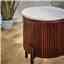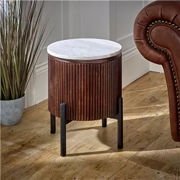 This captivating side table is ideal for keeping your drink, remotes, and mobile phone within easy reach while watching TV. The timeless marble top, adorned with an artistic fluted wood surround, adds an elegant touch. Sturdy metal legs provide a finishing touch to this entirely handmade piece, crafted by our skilled artisans in India using eco-friendly materials like 100% mango wood and natural marble.