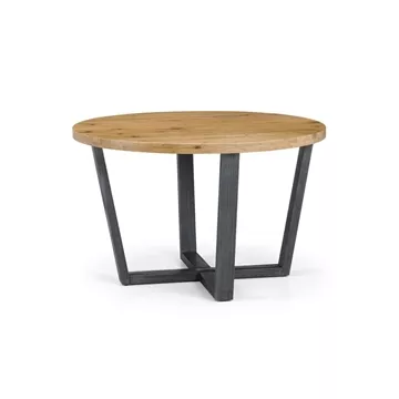 Crafted from solid oak, this round dining table boasts a rustic finish that accentuates the striking natural wood grain. The Brooklyn Round Dining Table adds a vintage touch with its industrial trestle-style metal legs. With ample space, this spacious table accommodates up to 4 people, making it an ideal fit for a variety of modern decor styles.