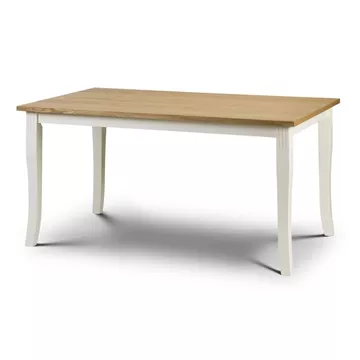 Constructed from solid rubberwood and featuring a genuine oiled oak veneer 25mm top, this dining table is perfect for delighting your dinner guests. With its elegant ivory lacquered finish, it complements any dining room decor seamlessly.