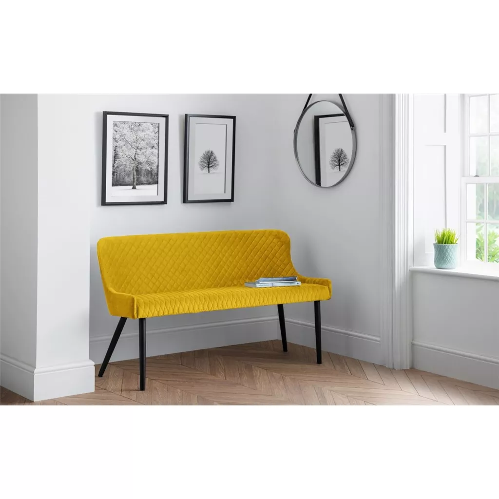 The Luxe High Back Bench blends a classic style with a modern twist, showcasing exquisite upholstery in a contemporary mustard velvet. Its luxurious quilted finish adds depth and texture, making it an ideal choice for dining or a captivating focal point in any room.