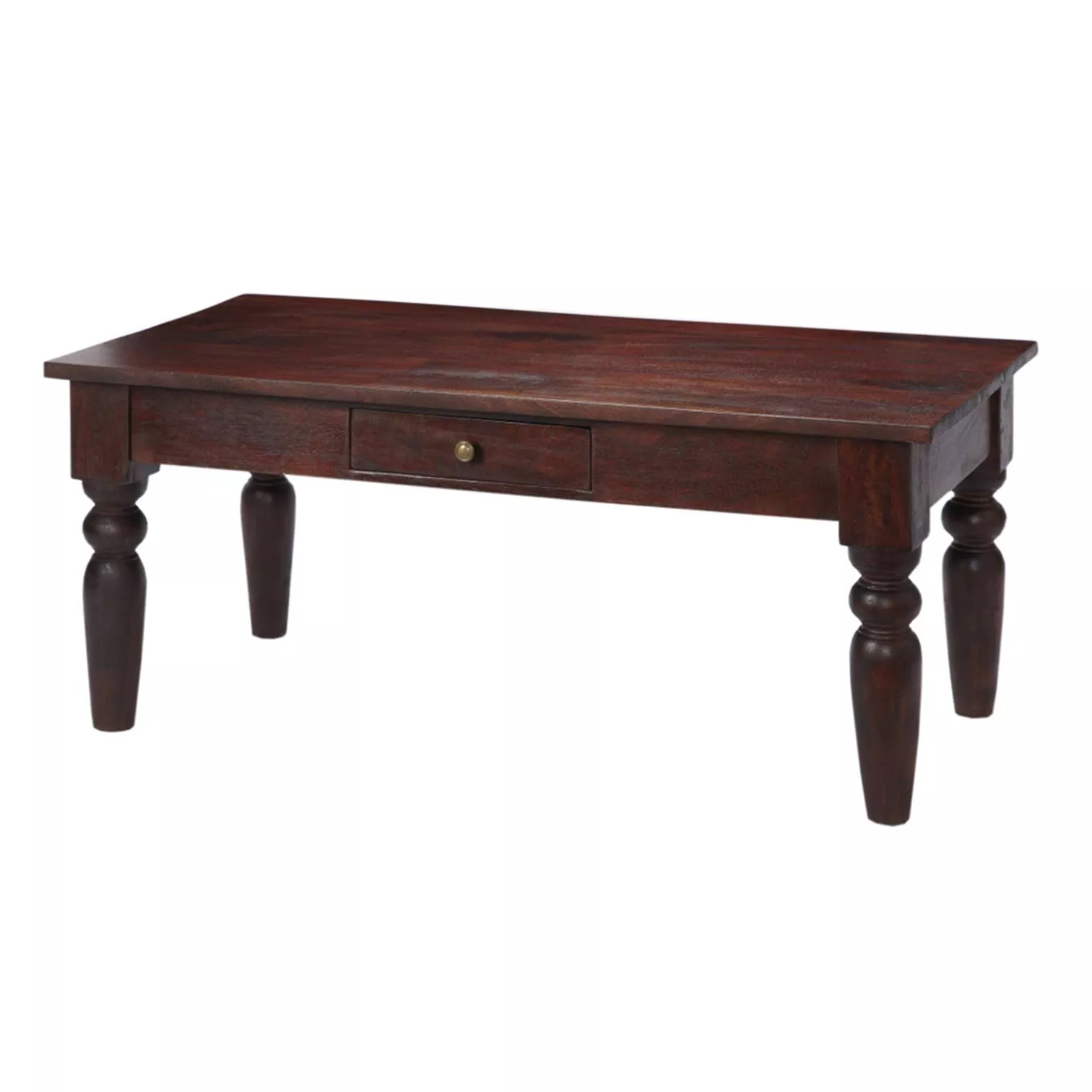 Hand made from Solid Mango Wood featuring brass handles and drawer in dark Mahogany hue.