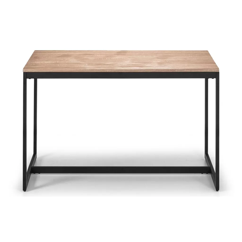 Crafted with a contemporary aesthetic in mind, this sleek dining table effortlessly enhances any dining area with its modern allure. Featuring clean lines accentuated by a refined black-coated metal frame, it seamlessly merges with its surroundings. The addition of a warm Sonoma oak foil finish further elevates its style, resulting in a chic and sophisticated centerpiece for any dining space.
